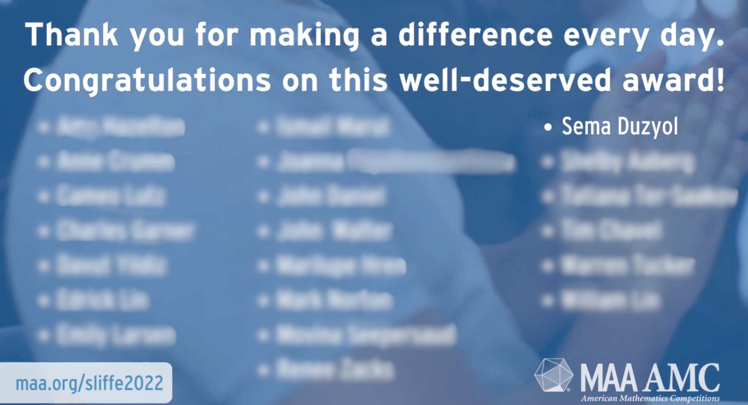 A two-time recipient of this national honor from the Mathematical Association of America (MAA) for distinguished mathematics teaching, Mrs. Duzyol received this award in recognition of her exceptional ability to prepare students for the American Mathematics Competitions (AMC). The Edyth May Sliffe Award is presented annually to teachers whose students demonstrate outstanding performance on the AMC 10 and AMC 12 examinations, reflecting not only individual student achievement but also the teacher’s sustained commitment to mathematical excellence. Mrs. Duzyol’s students consistently rank among the top performers nationally, a testament to her rigorous curriculum design, innovative problem-solving methodologies, and dedication to fostering a culture of mathematical inquiry.